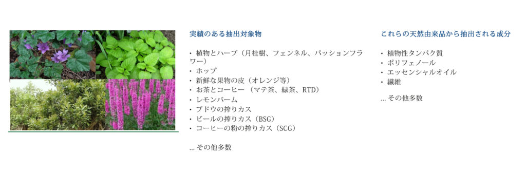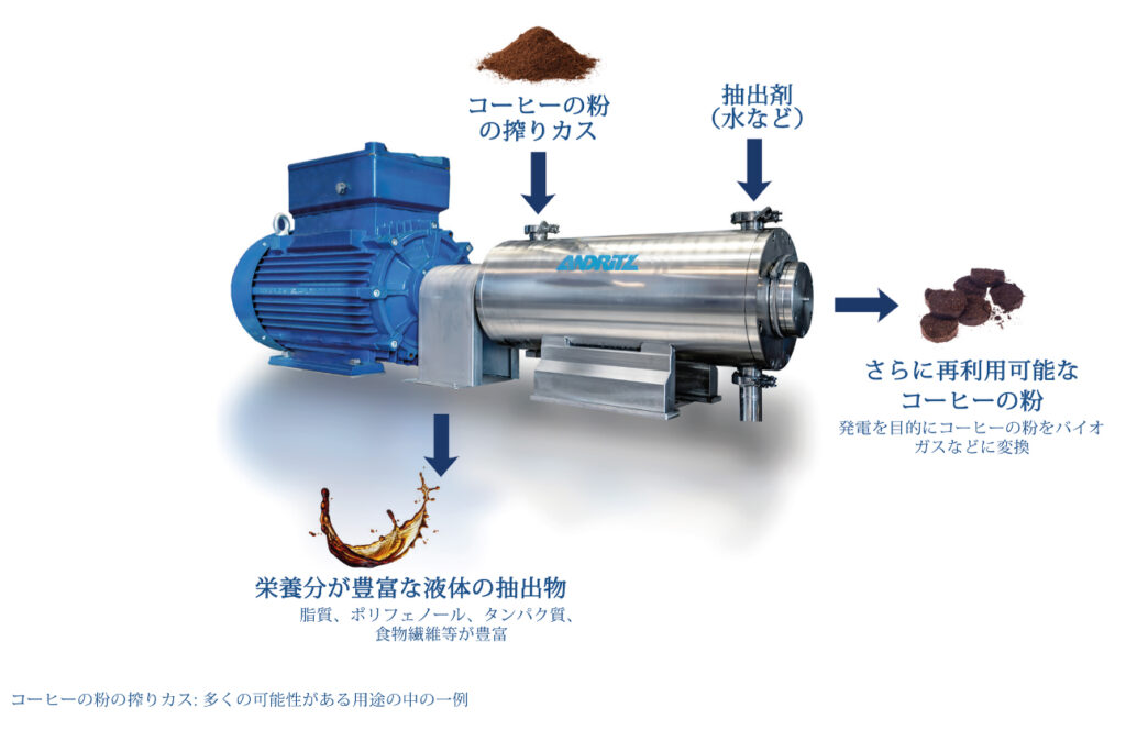 コーヒーの抽出の場合、飲用として利用されるのは約10%で廃棄物として90%は捨てられます。この90%の抽出カスにはカフェインやカテキンが多く含まれております。これらを回収し、健康食品として再利用することが、貴重な資源の再利用に繋がり、欧米ではアップサイクルに繋がる技術は、高く評価されています。